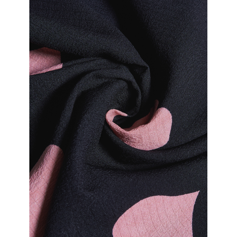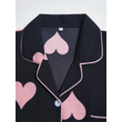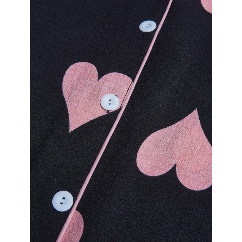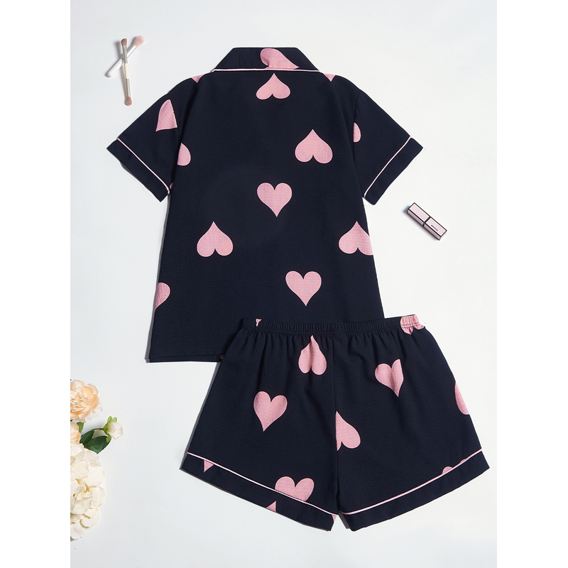 Heart Print Pajama Set With Contrast Color Piping Lapel Collar Button-up Comfortable Leisure Sleepwear