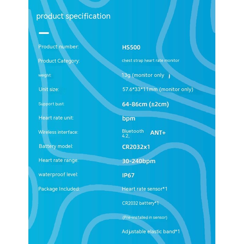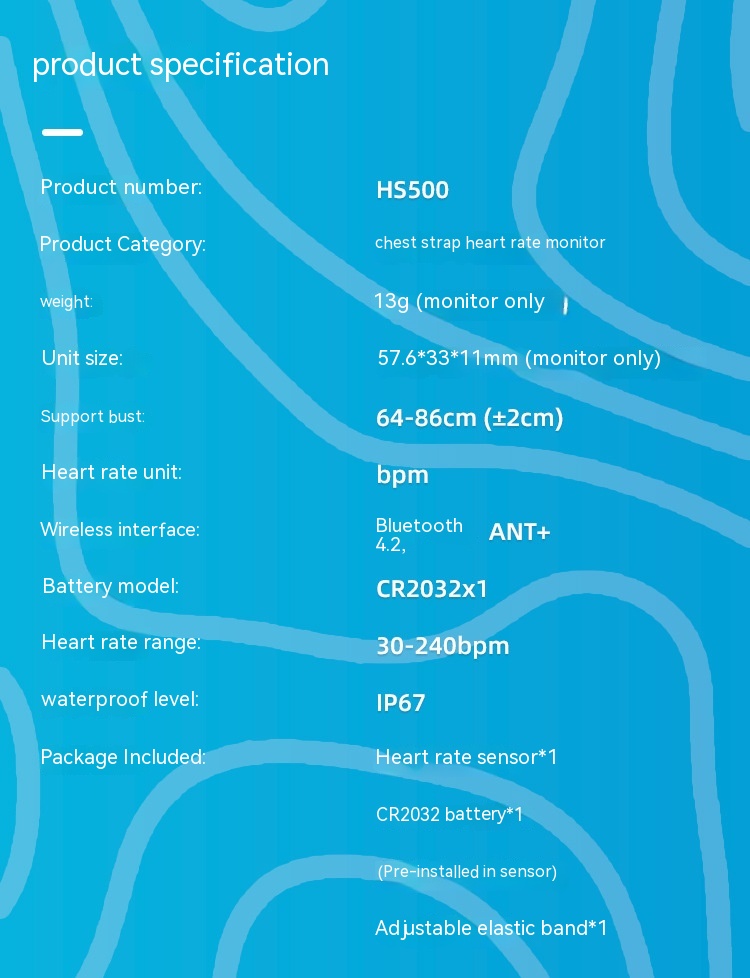Heart rate sensor * 1+CR2032 battery * 1 (pre installed in the sensor)+adjustable elastic band*1