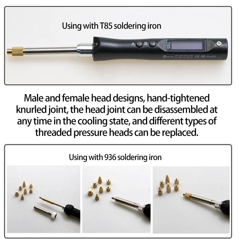 2. Product scope of application: This product uses soldering iron tips adapted to HS01/T85/SH72 soldering iron , and is interchangeable with standard 936 universal soldering iron tips, and is used for M2 (common to M2.5), M3, M4, M5, M6 (1/4"), Hot-melt nuts or inserts such as M8 are often used for hot-melt copper nuts printed on 3D printers or to embed nuts on plastics.