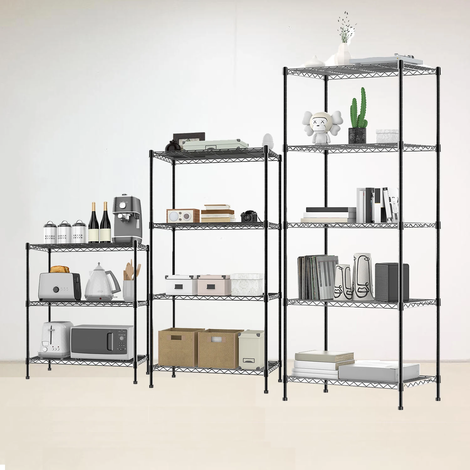 3/4/5-tier standing wire shelving rack is designed to be sturdy, looks nice, works great. Each shelf holds up to 40 kg of evenly distributed weight for a total unit weight capacity of 200kg.