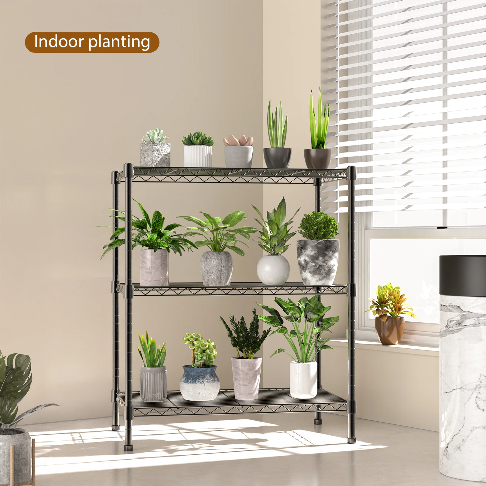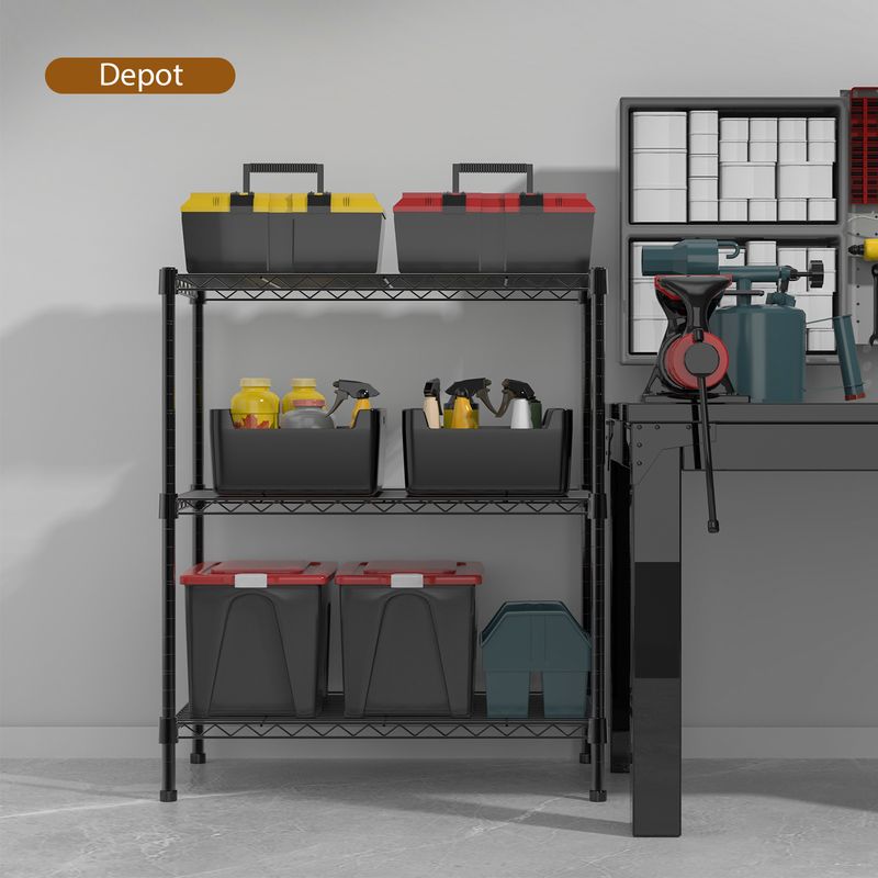 【3/4/5 Tier Shelving Unit】 Made from durable steel construction with black-coated finish; with adjustable levelling feet for increased stability on uneven ground.
