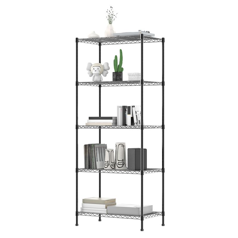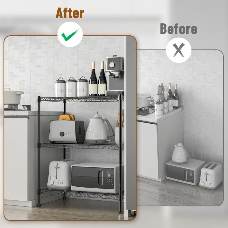 【3/4/5 Tier Shelving Unit】 Made from durable steel construction with black-coated finish; with adjustable levelling feet for increased stability on uneven ground.