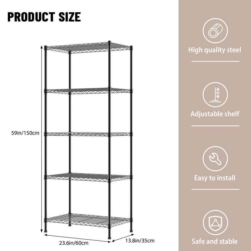 3/4/5-tier standing wire shelving rack is designed to be sturdy, looks nice, works great. Each shelf holds up to 40 kg of evenly distributed weight for a total unit weight capacity of 200kg.