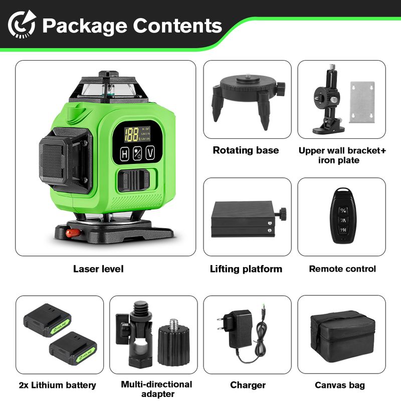 -Two control modes: Mobile APP remote control and Bluetooth remote control, you can select the lines you needed by the remoter when you are inconvenient to move the laser level.