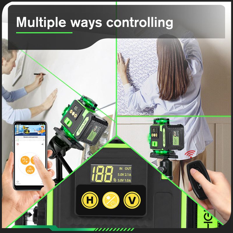 ��Two control modes: Mobile APP remote control and Bluetooth remote control, you can select the lines you needed by the remoter when you are inconvenient to move the laser level.