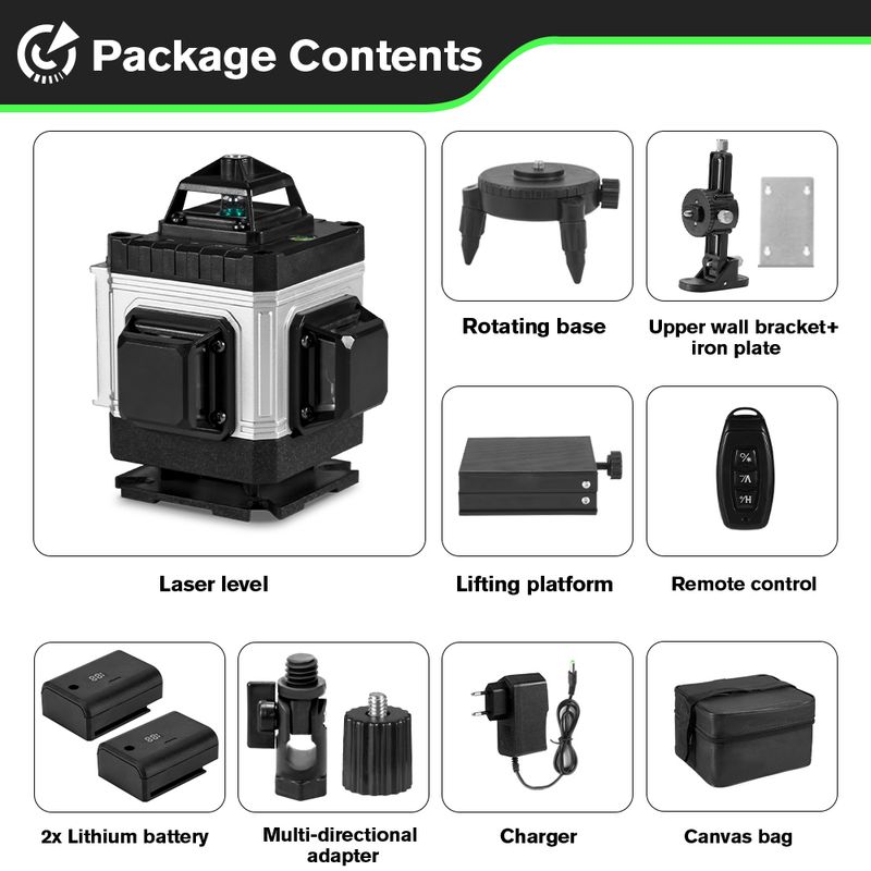 - Output 16 laser lines separately or simultaneously, providing more precise positioning and featuring a 3° self-leveling system, which is flexible and stable.