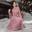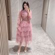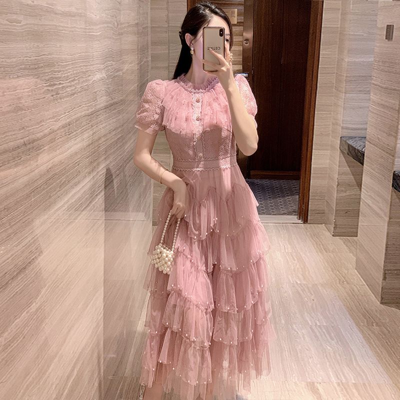 High End Pink Beading Summer Women Lace Sweet French O Neck Short Sleeve Mesh Cascading Ruffles Cake Casual Party Dresses