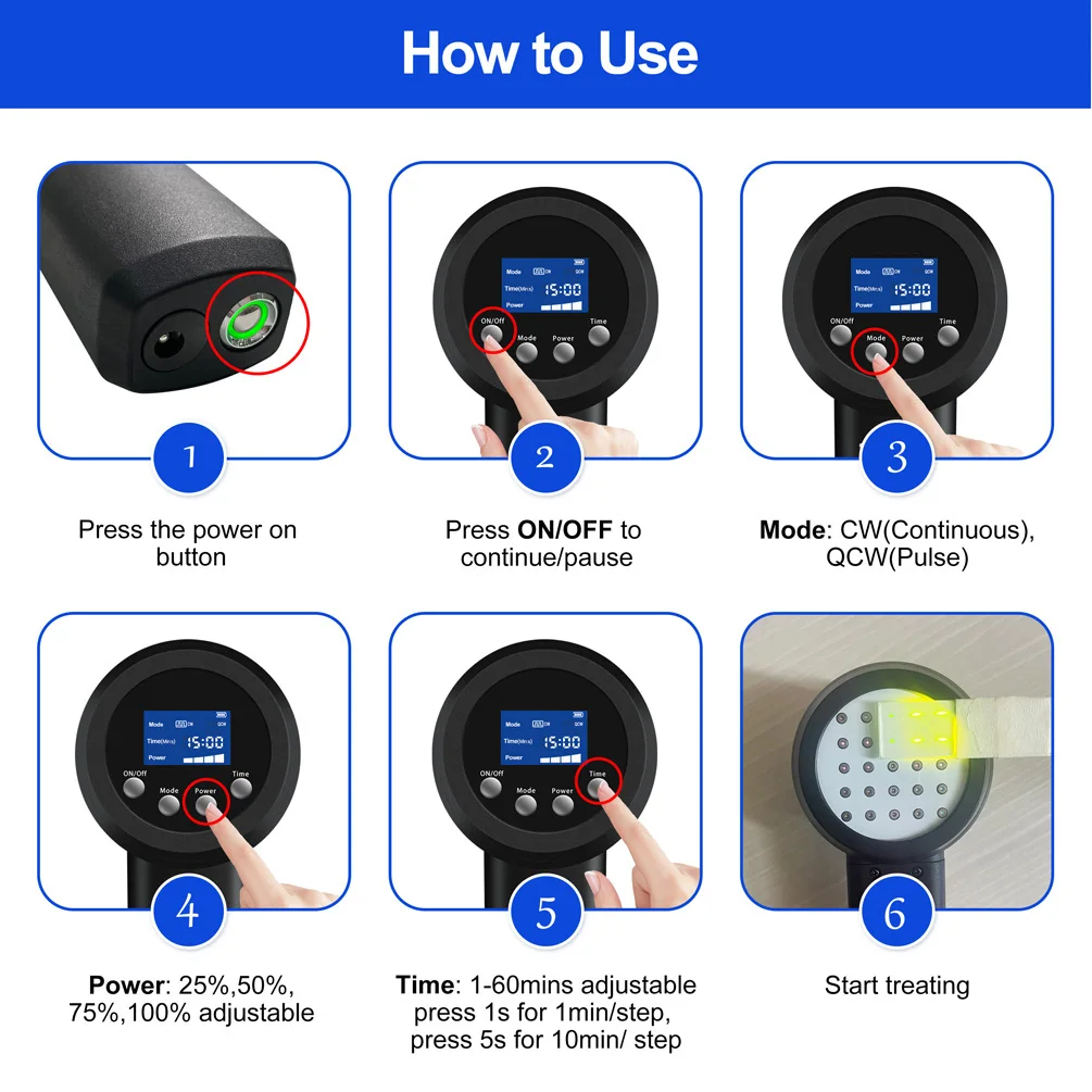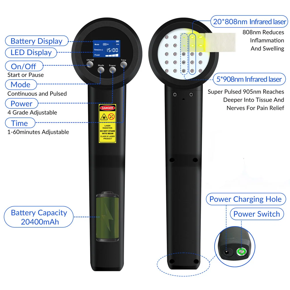 【Handheld Laser Pain Therapy at Home】The class IV laser therapy device is powerful,portable and rechargeable. Four Grades Power Adjustable (25%,50%,75%,100%); Two working modes Adjustable: Continuous Wave & Pulsed Wave ( There is evidence proven that PW is superior to CW for most application except nerve regeneration ). Time: 1-60 Minutes Adjustable. The screen can shows the functions clearly. It is recommended to use 1-2 times a day for 10-15 min.