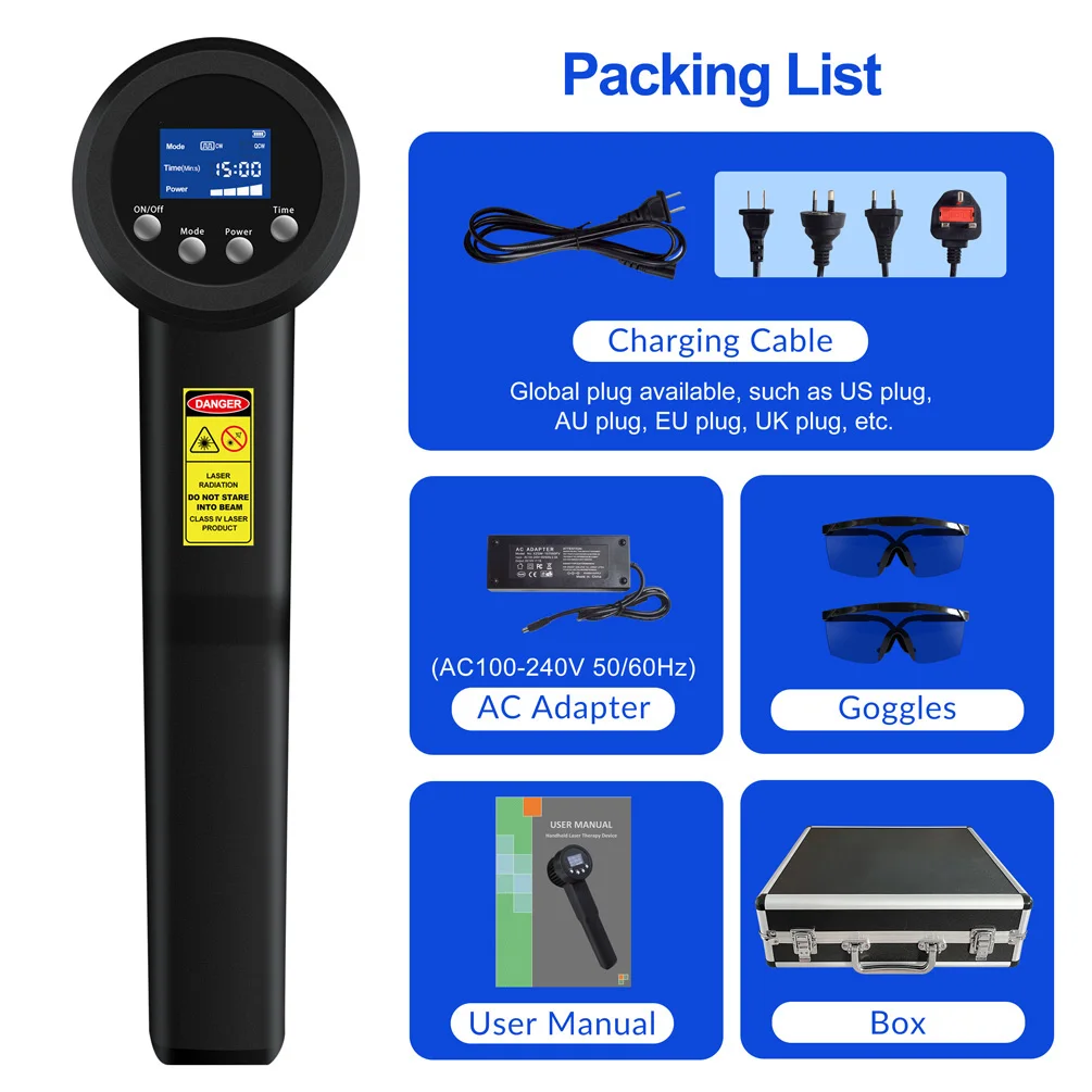 【Packaging and 100% Service】This infrared therapy equipment includes 1x laser therapy device, 1xAC adapter, 1x plug, 1xUser manual, 2xGoggles, 1xPacking box. The mls laser device is very durable, and we provide one year warranty. The pain relieve laser devices are really great gifts for your family and friends. If you have any questions about our near infrared laser machine, please feel free to contact us, we will answer your questions within 24 hours.