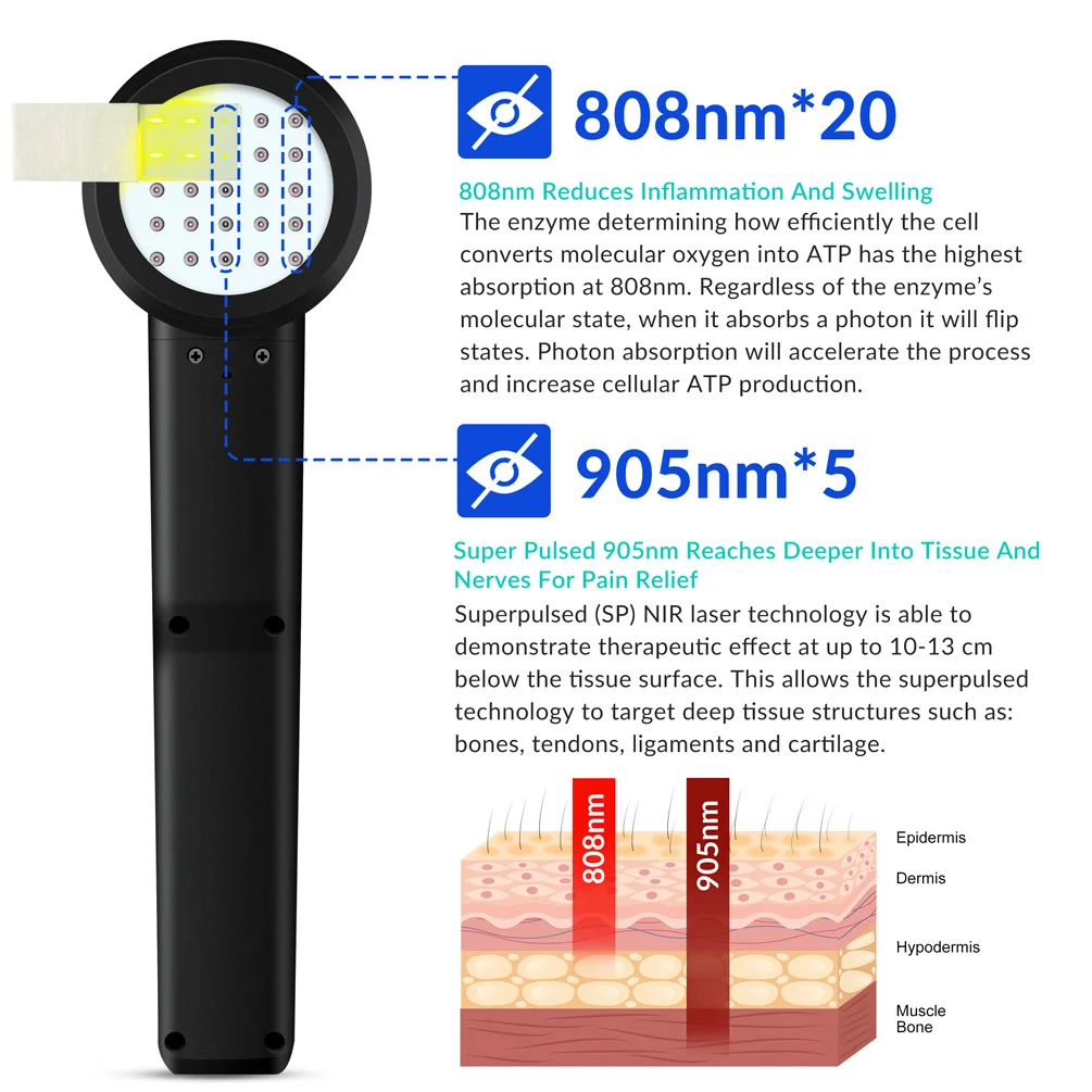 【Near Infrared Light Therapy】The near infrared light therapy devices include 808nm+905nm. The 808nm wavelength is effe ctive for deep tissue penetration and is often used for its analgesic and anti-inflammatory properties.The 905nm wavelength penetrates tissues well and is often used in applications like wound healing and pain relief.