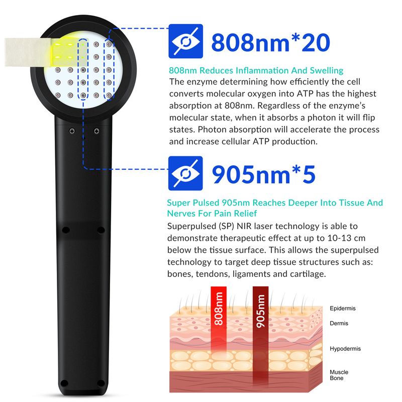 【Near Infrared Light Therapy】The near infrared light therapy devices include 808nm+905nm. The 808nm wavelength is effe ctive for deep tissue penetration and is often used for its analgesic and anti-inflammatory properties.The 905nm wavelength penetrates tissues well and is often used in applications like wound healing and pain relief.