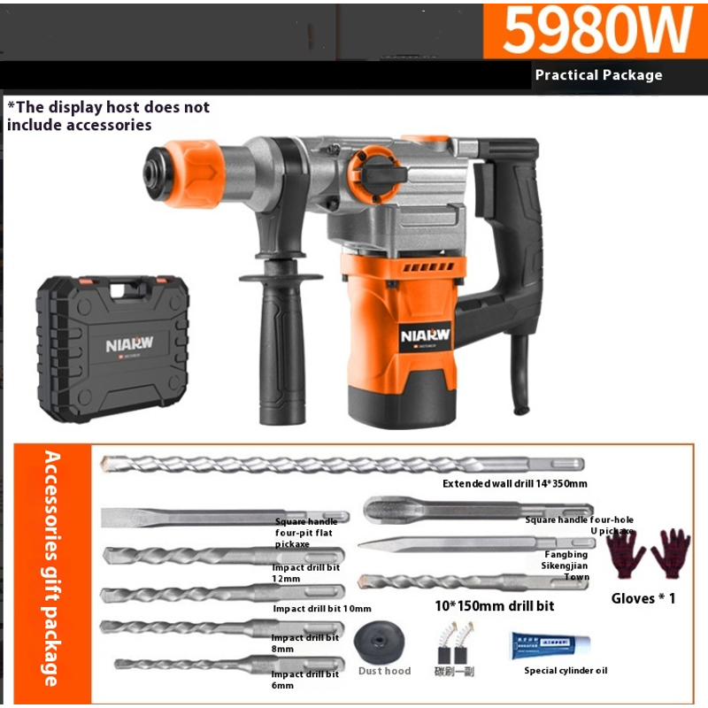 1 * high-power impact electric hammer electric drill 1 * lengthened Wall drill 14 * 350mm 1 * round handle four pits flat pick 1 * round handle chopping bit 12mm 1 * round handle chopping bit 10mm 1 * round handle chopping bit 8mm 1 * round handle chopping bit 6mm 1 * round handle four pits U Pick 1 * round handle four pits Sharp pick 1 * round shank drill 10 * 15mm 1 * dust Hood 1 * Special cylinder oil 1 pair of gloves 1 pair of carbon brushes