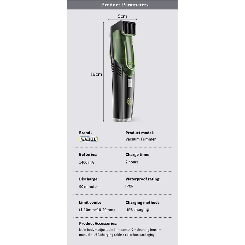 Product Accessories: Main body + adjustable limit comb *2 + cleaning brush + manual + USB charging cable + color box packaging