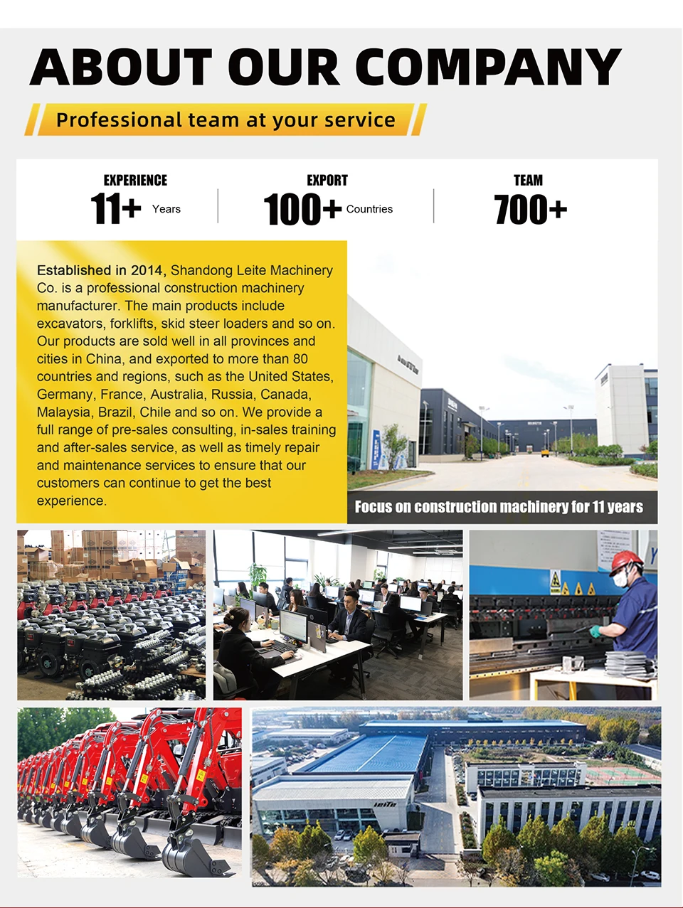 LEITE Machinery has 12 years of manufacturing and export experience, owns the largest construction machinery production base in China, with a team of over 700+ ensuring quality.
