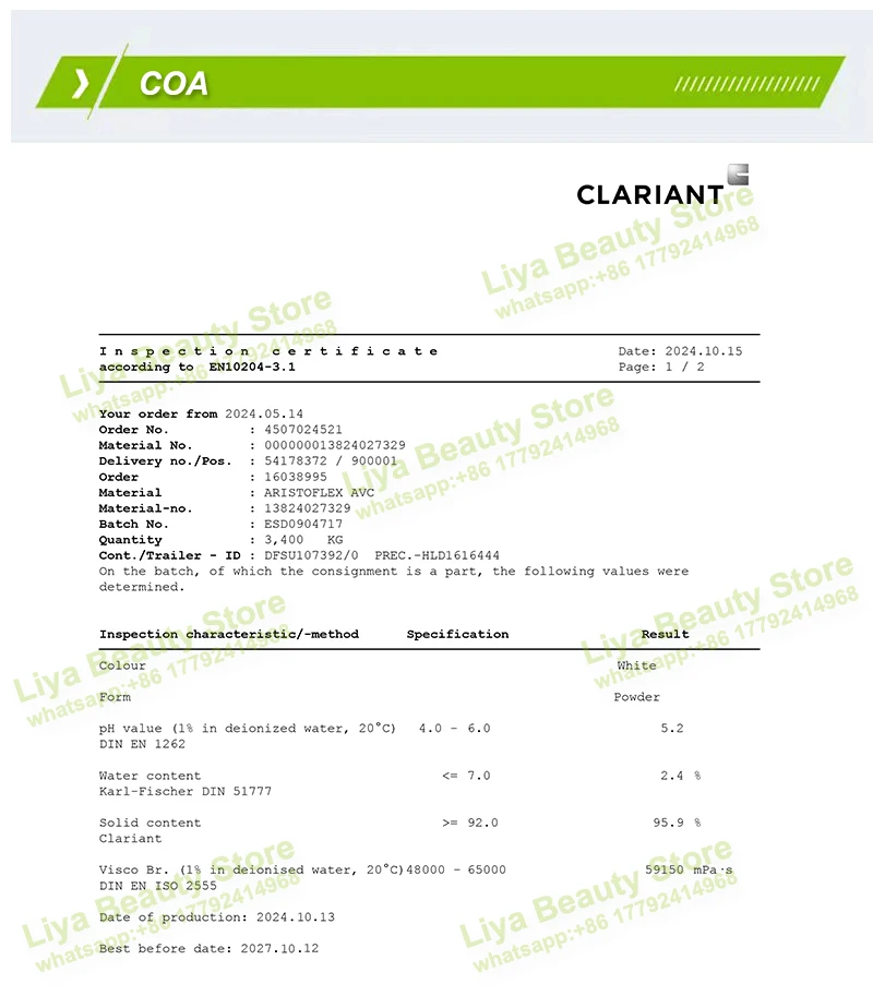 Aristoflex AVC has good compatibility with organic solvents such as ethanol and acetone, and remains stable under ultraviolet light irradiation or high shear forces. The addition amount of Aristoflex AVC in personal care products is 0.5-1.2%.