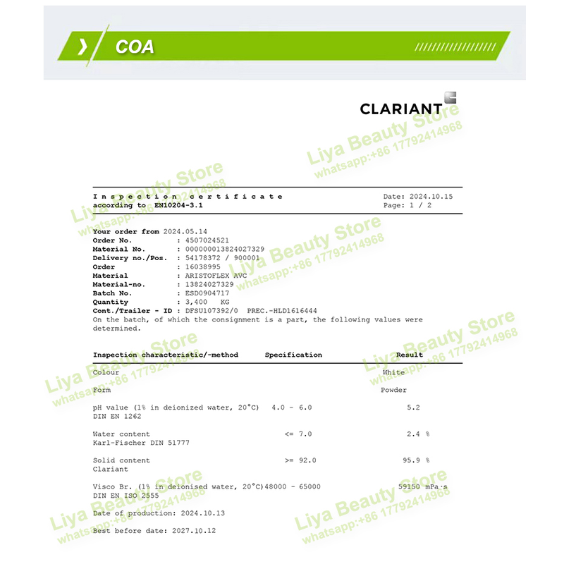 Aristoflex AVC has good compatibility with organic solvents such as ethanol and acetone, and remains stable under ultraviolet light irradiation or high shear forces. The addition amount of Aristoflex AVC in personal care products is 0.5-1.2%.
