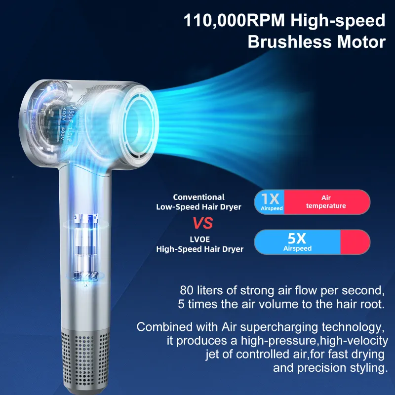 Hair Dryer High Speed 29m/s Air Speed 110,000rpm Motor 59dB Quick Dry Negative Ion Blow Dryer Hair Care Professional Hair Dryer