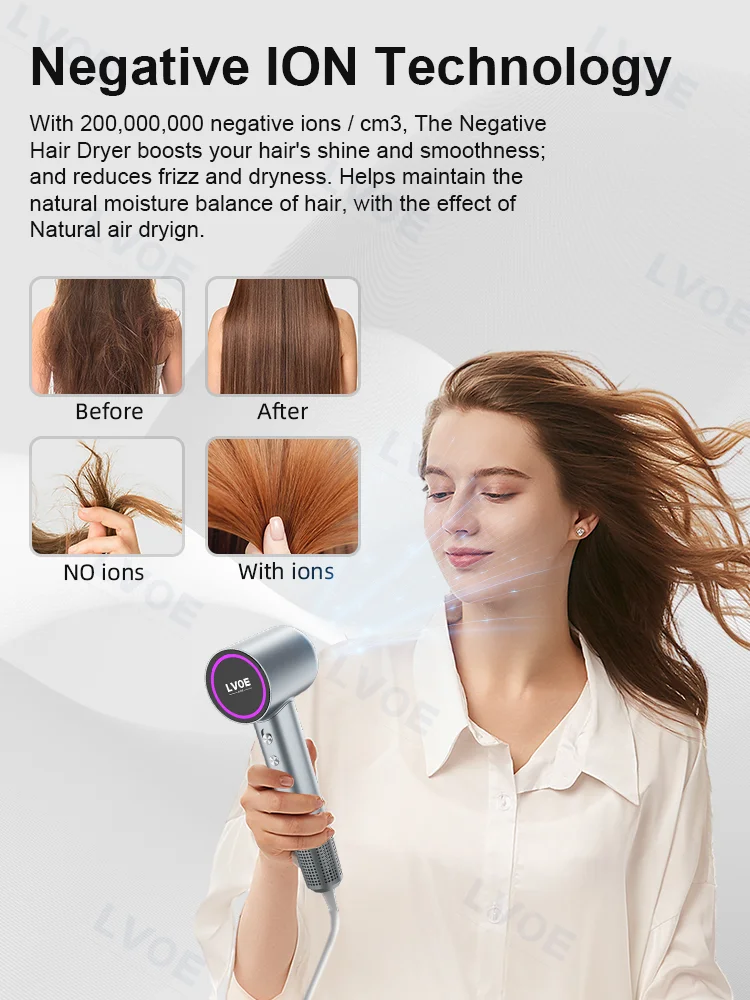 With 200,000,000 negative ions / cm3, The Negative Hair Dryer boosts your hair's shine and smoothness;