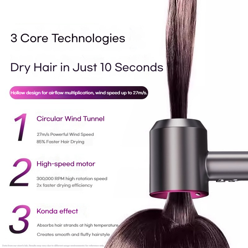 High-speed brushless motor, negative ion hair care, strong wind fast drying, low noise, multi-speed temp control.