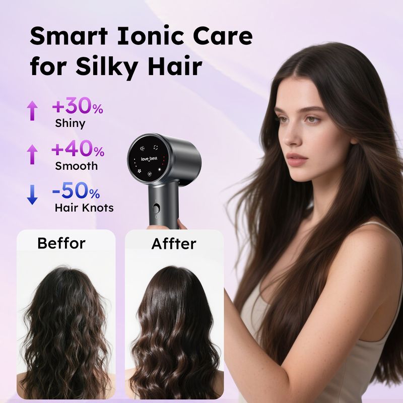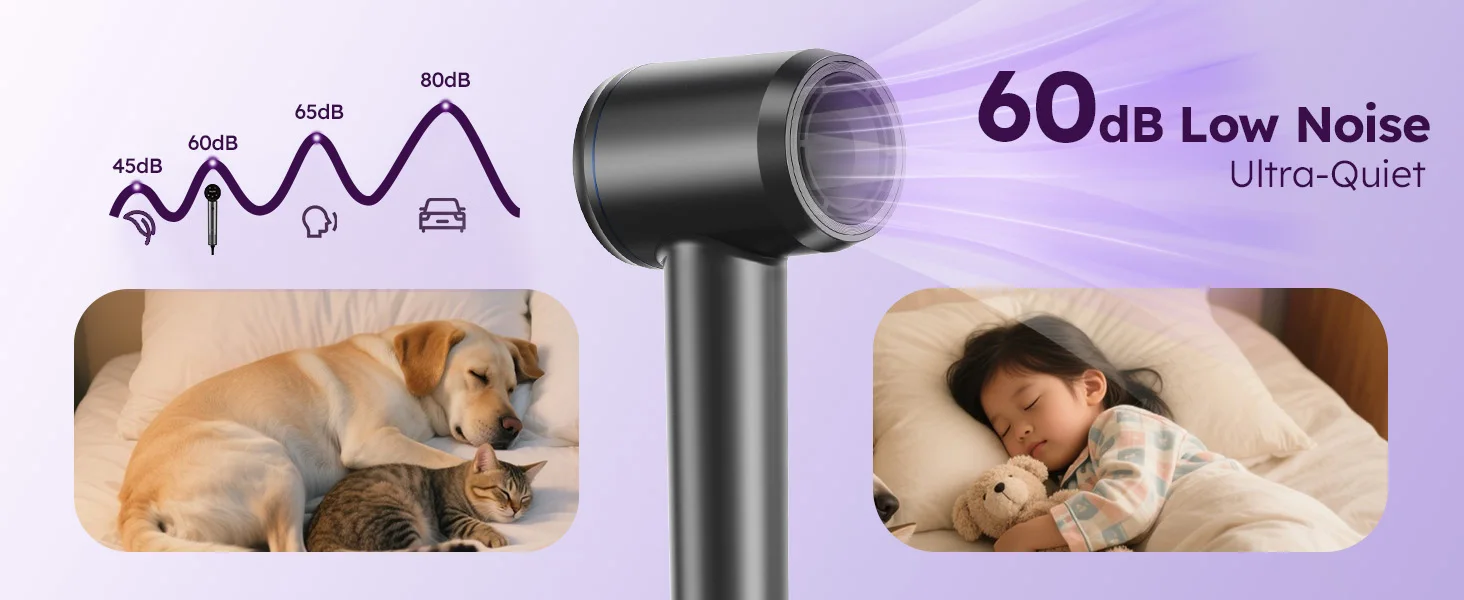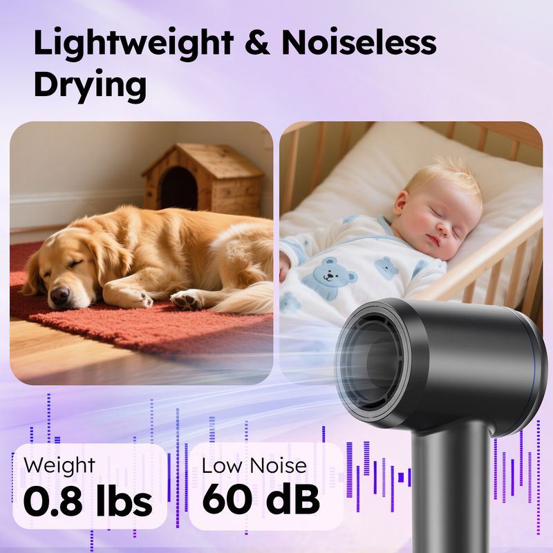 Our exclusive Gentle Breeze Mode is designed for babies, sensitive scalps, and even pets. With a quiet 67dB operation, it creates a calm, safe drying experience — perfect for parents, pet owners, and anyone seeking a kinder approach to hair care