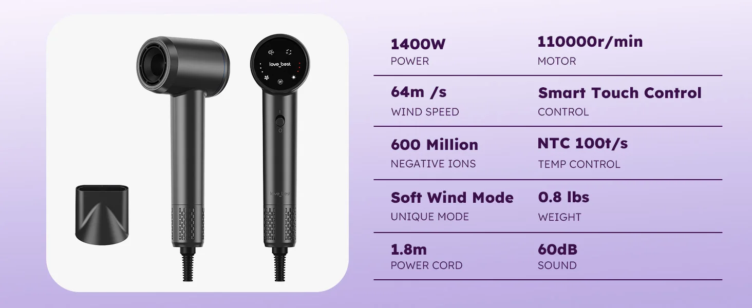 Powered by a 110,000 RPM brushless motor, this high-speed blow dryer delivers a turbo-charged 64m/s wind that dries hair 5× faster than traditional dryers. Ideal for long, thick, or curly hair - dry and go in just 2-4 minutes, saving time every day