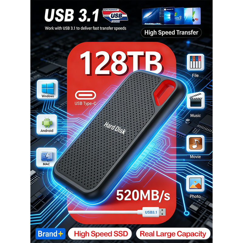High-speed SSD 128TB External Hard Drive Portable 1TB Solid State Drive 16TB Mass External Hard Disk for Laptop/MAC/PC/AI Data