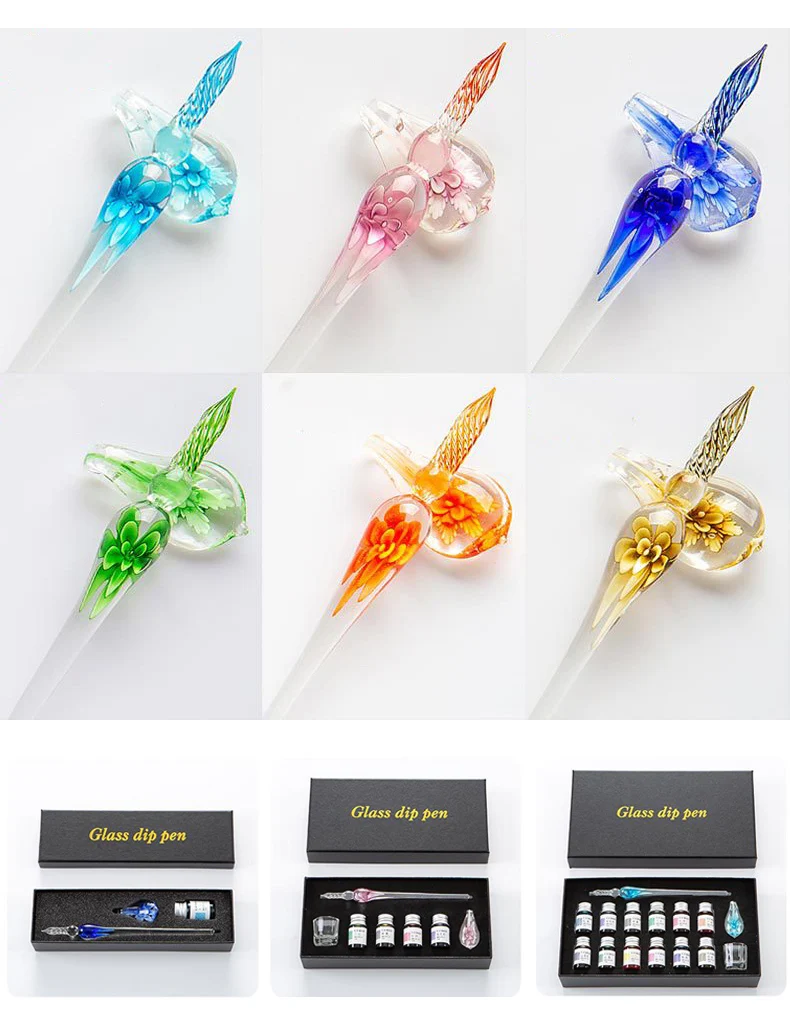 Highergo 3/7/15 Pcs 3D Flower Glass Pen Set Crystal Handmade Dip Pen Writing Drawing Calligraphy Gifts Stationery Art Supplies