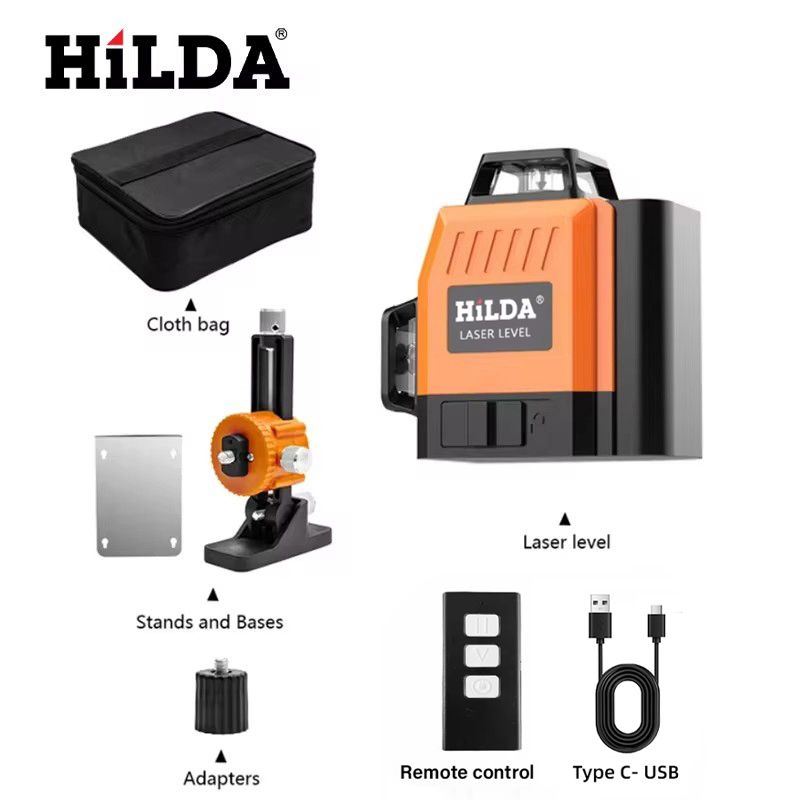 HILDA 3D/4D 12/16 Lines Laser Level with USB Charging Cable and Remote Control Rechargeable Self-leveling 360 Green Line level