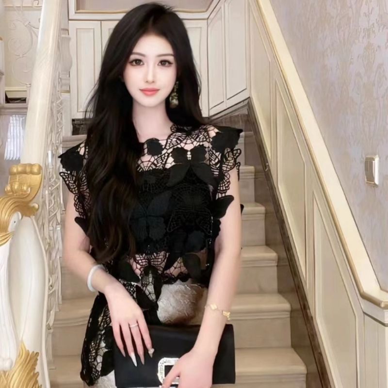 Hollow Out Bow Short Sleeve Lace Temperament Tops Summer New Sleeveless Solid Loose Elegant T Shirts Fashion Sexy Women Clothing
