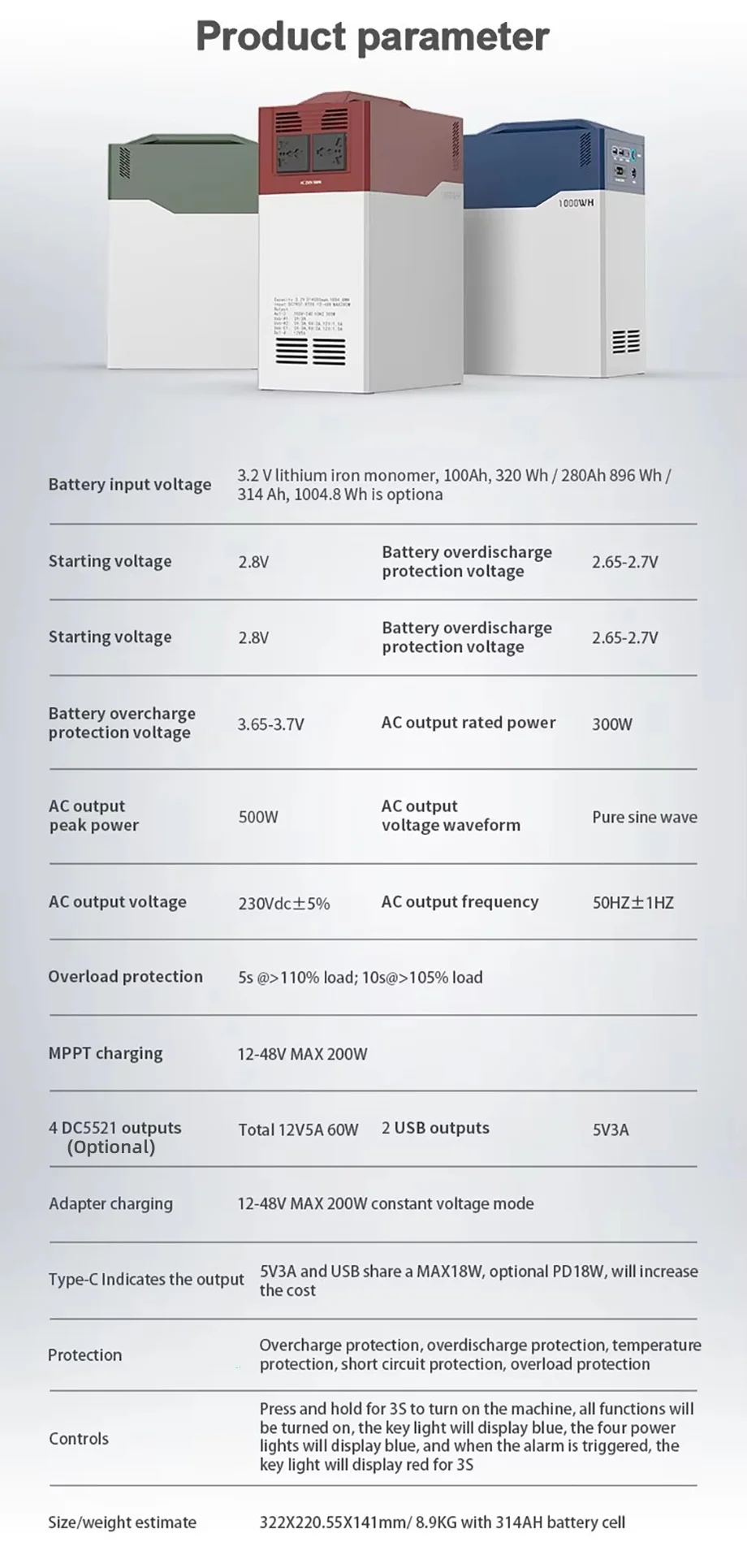 1kWh Solar Generator 300W Fast Charging PV Input Lifepo4 Battery USB AC Outlets Strong Portable Power Station for Clippers