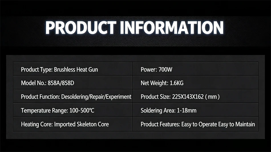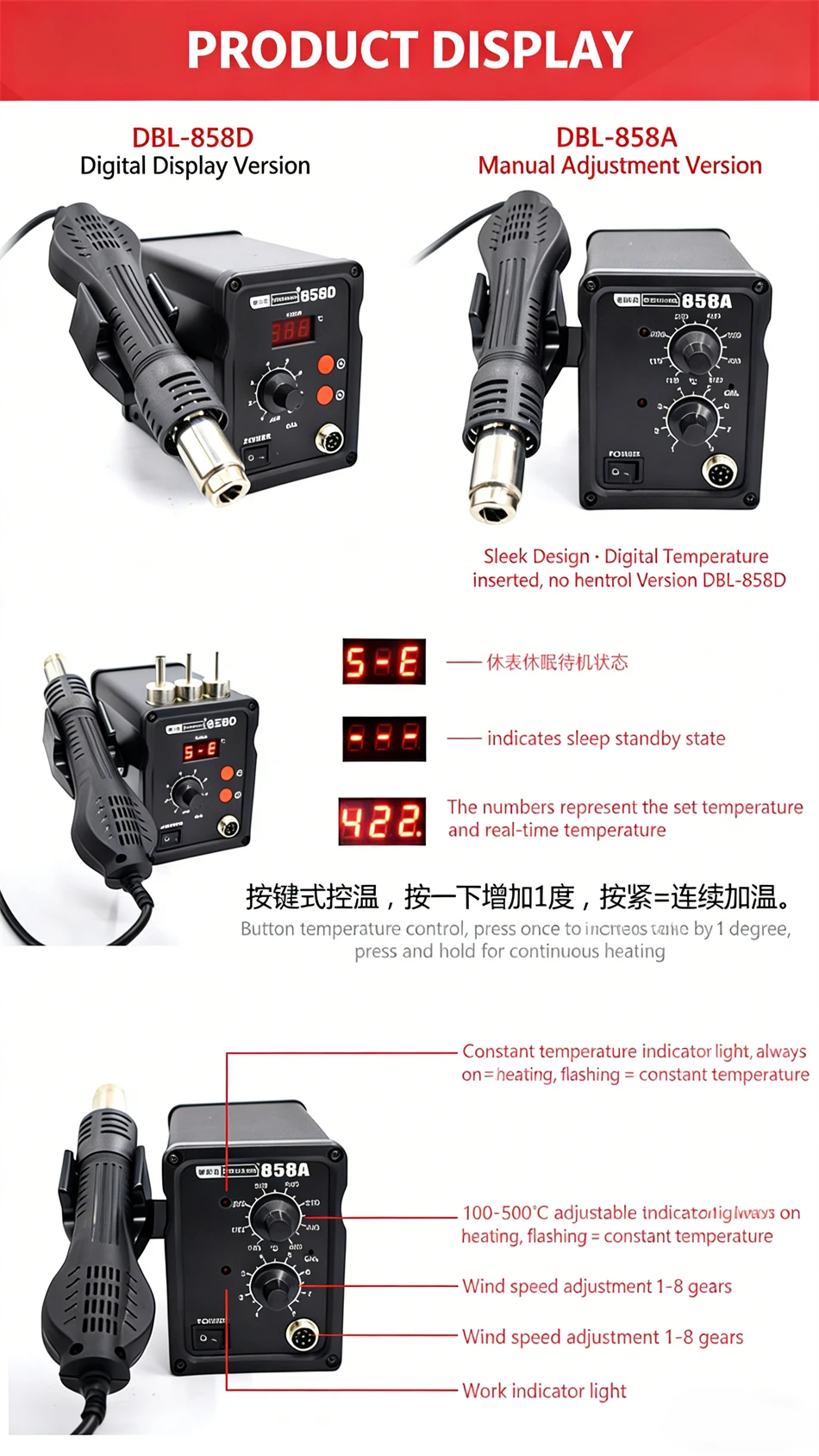 · Automatic cooling function for effectively prolonging the heater's life and protecting the hot air gun;