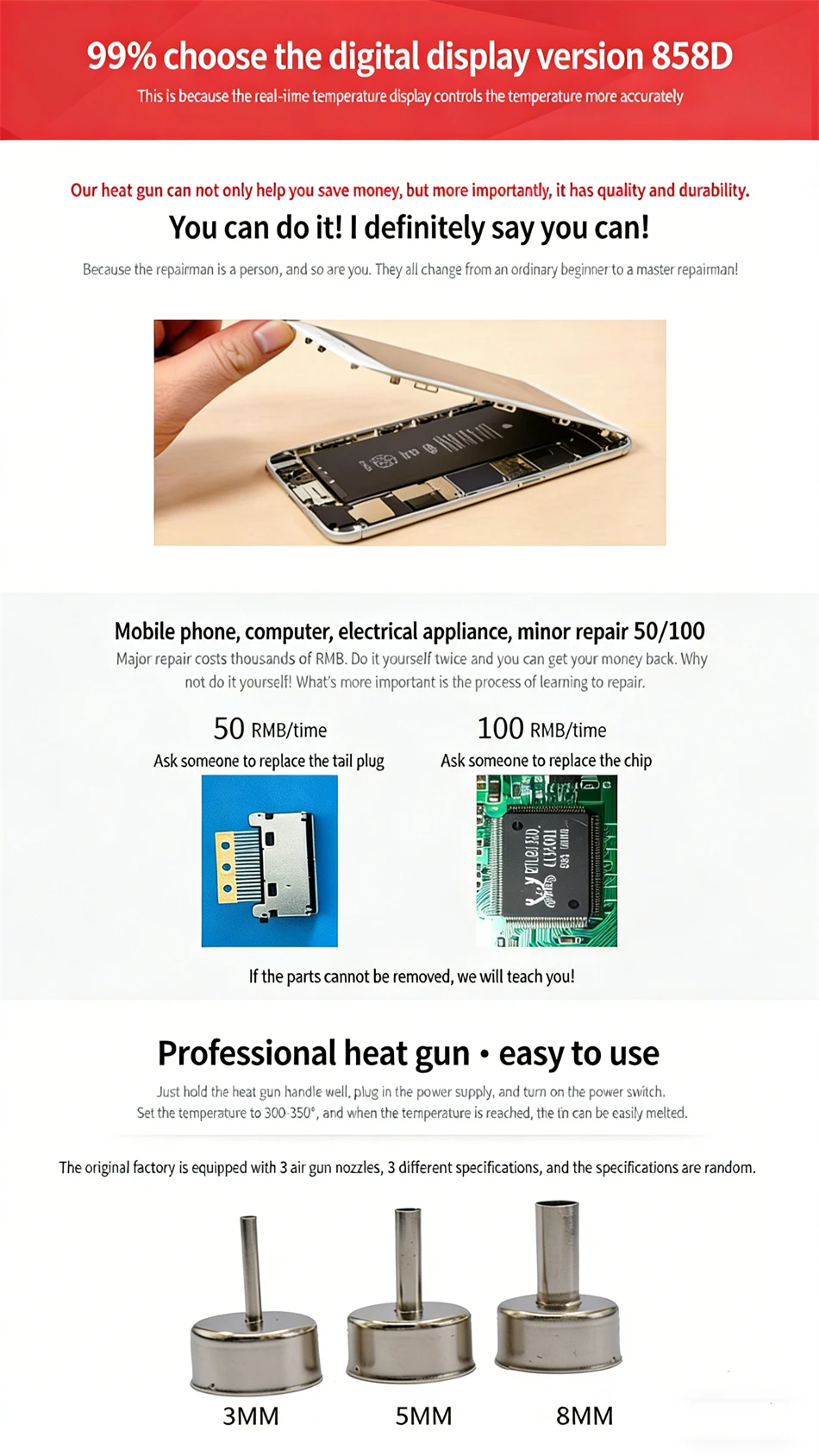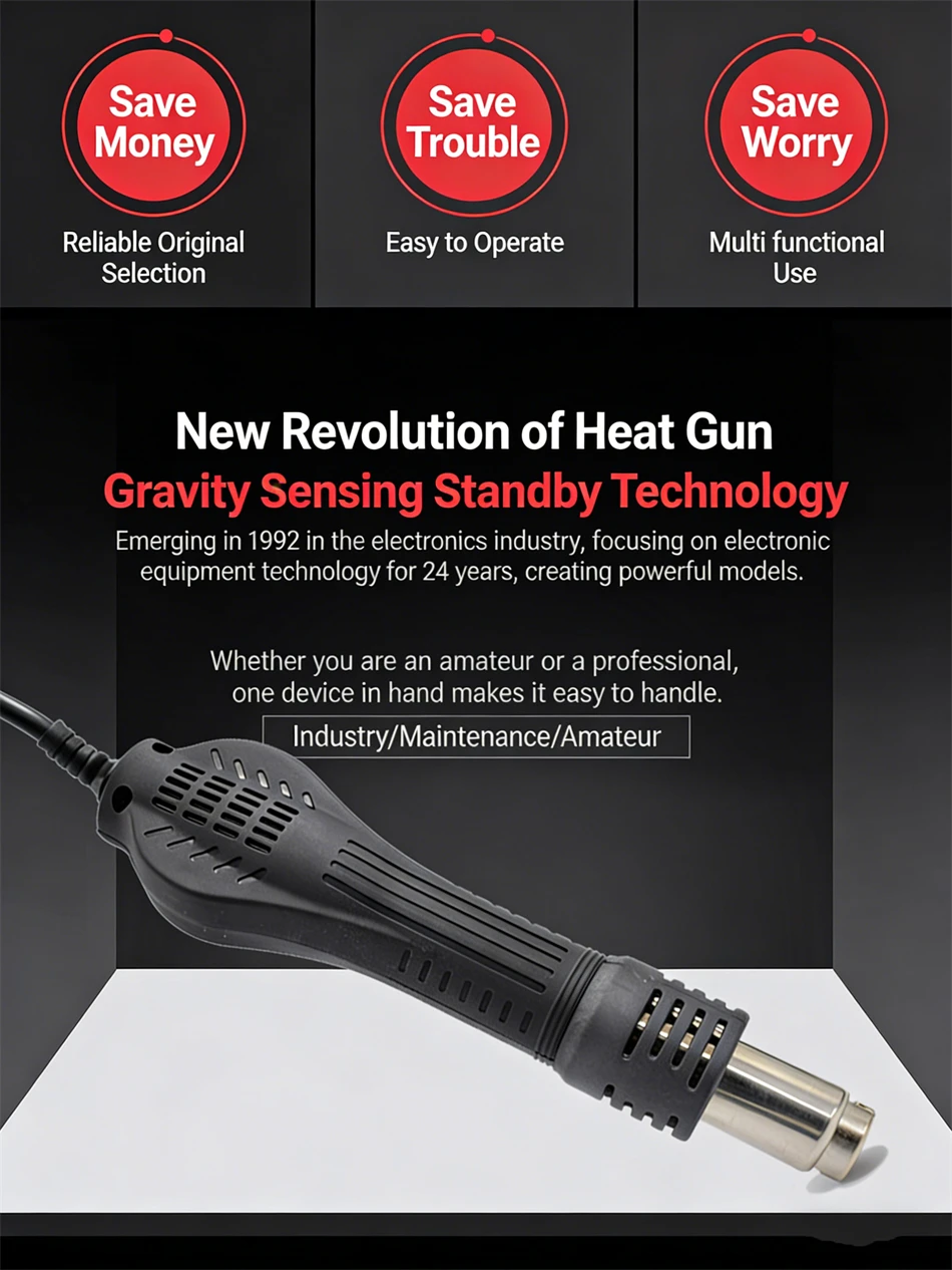 · Fits for heating shrink, drying, lacquer removal, viscidity removal, ice-out, pre-heating and glue soldering;