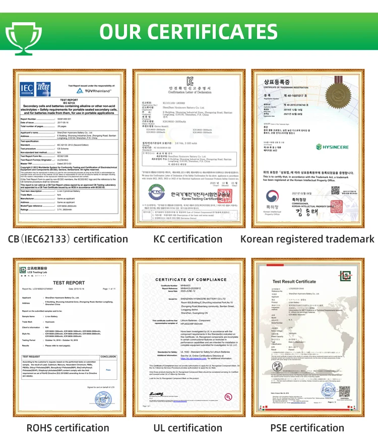 PSE, METI, UL, CE, REACH, FCC, IEC61000, UN38.3, MSDS