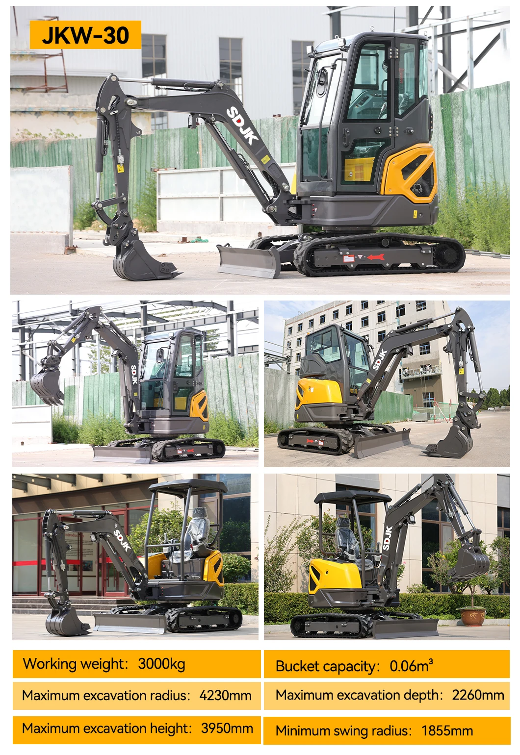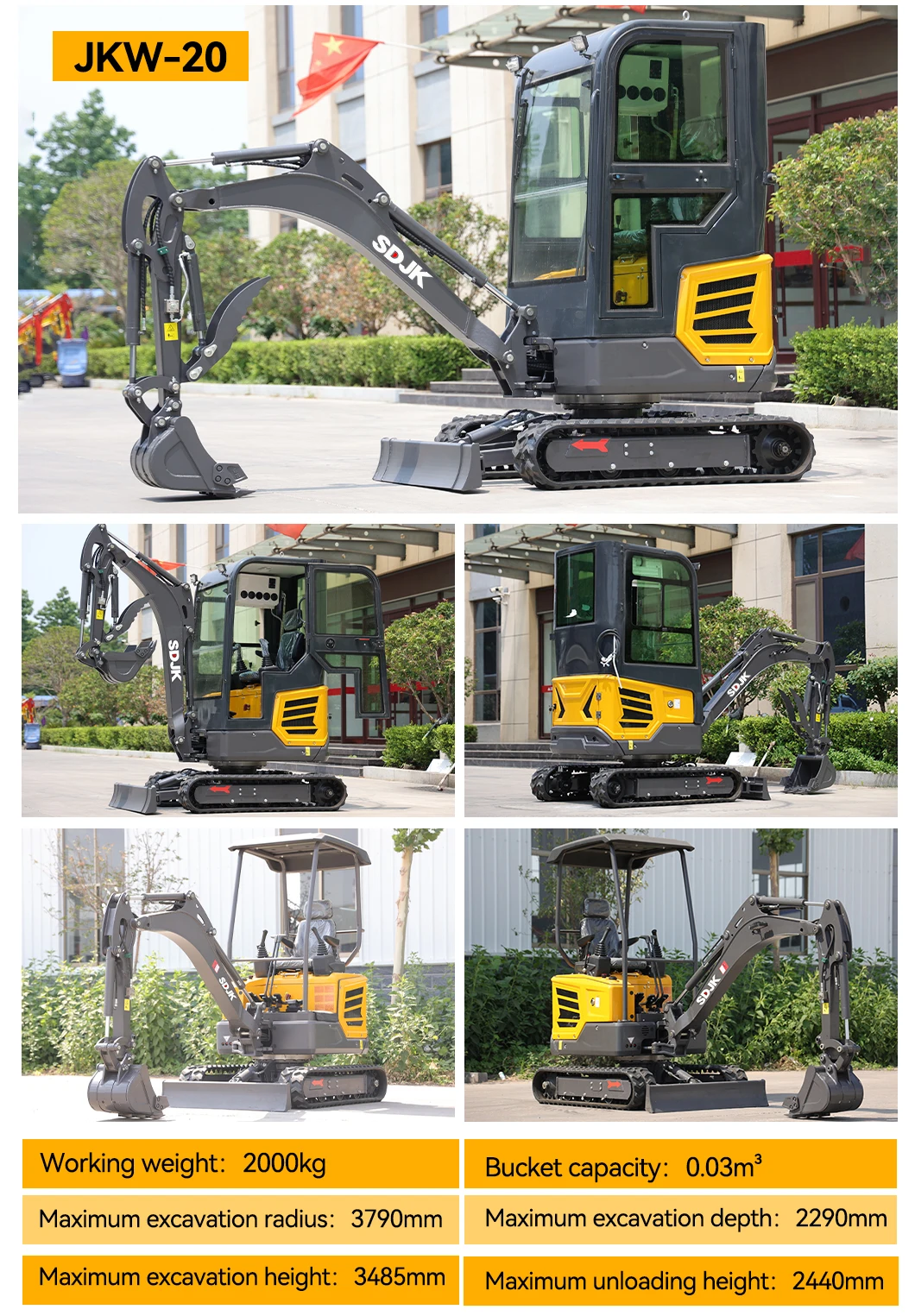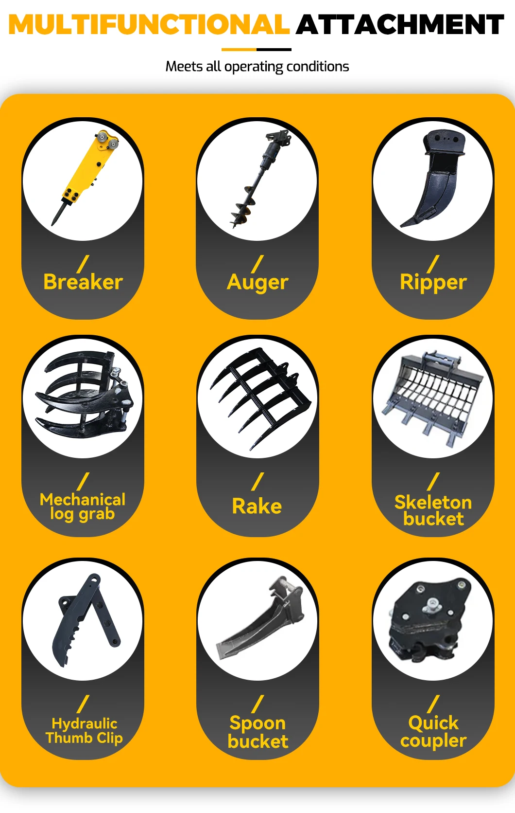 3. Attachments: Excavator with auger, grapple, hydraulic breaker, ripper, rake, tilt bucket, leveling bucket, rails, quick coupler, etc.