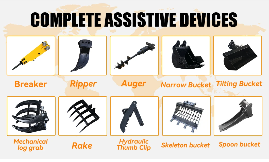 3. Attachments: Excavator with auger, grapple, hydraulic breaker, ripper, rake, tilt bucket, leveling bucket, rails, quick coupler, etc.