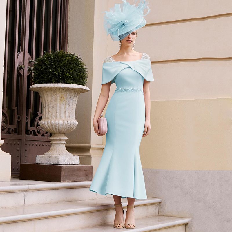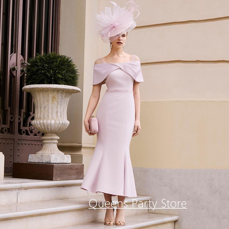 Hot Selling Wedding Party Dress Customized Off The Shoulder Pearls Tea Length Mermaid Mother of The Bride Gown Cocktail Dresses