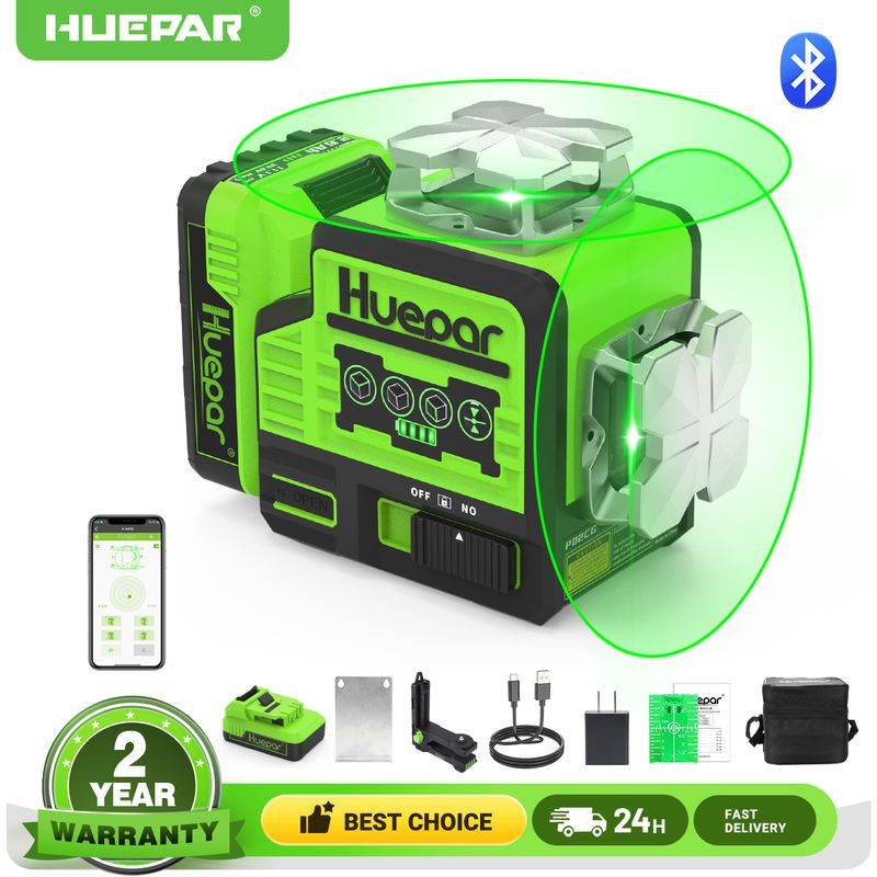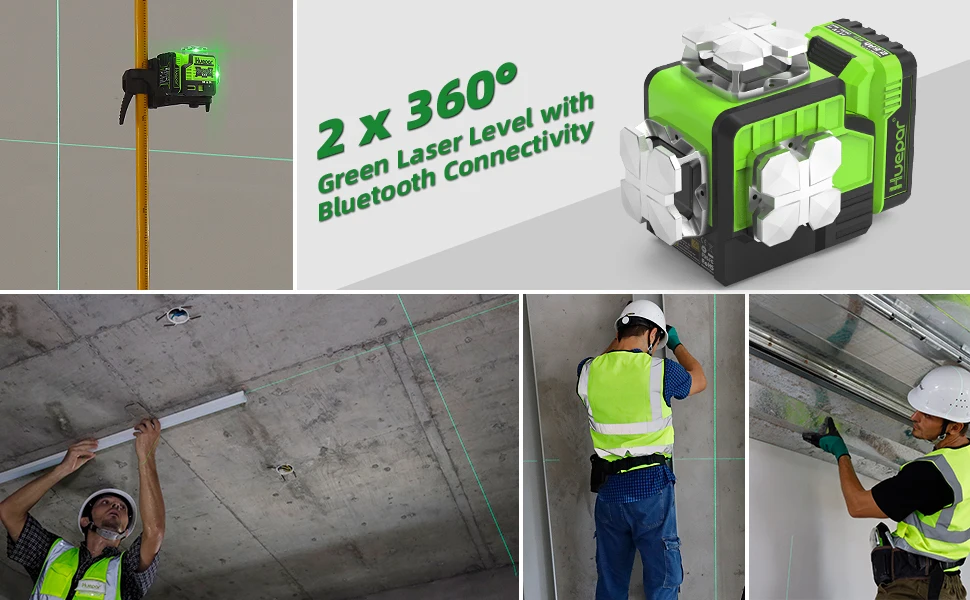 Huepar 360° Laser Level Self Leveling Bluetooth Remote Control Green Beam Cross Line 2D Laser with Large Capacity Li-ion Battery