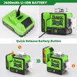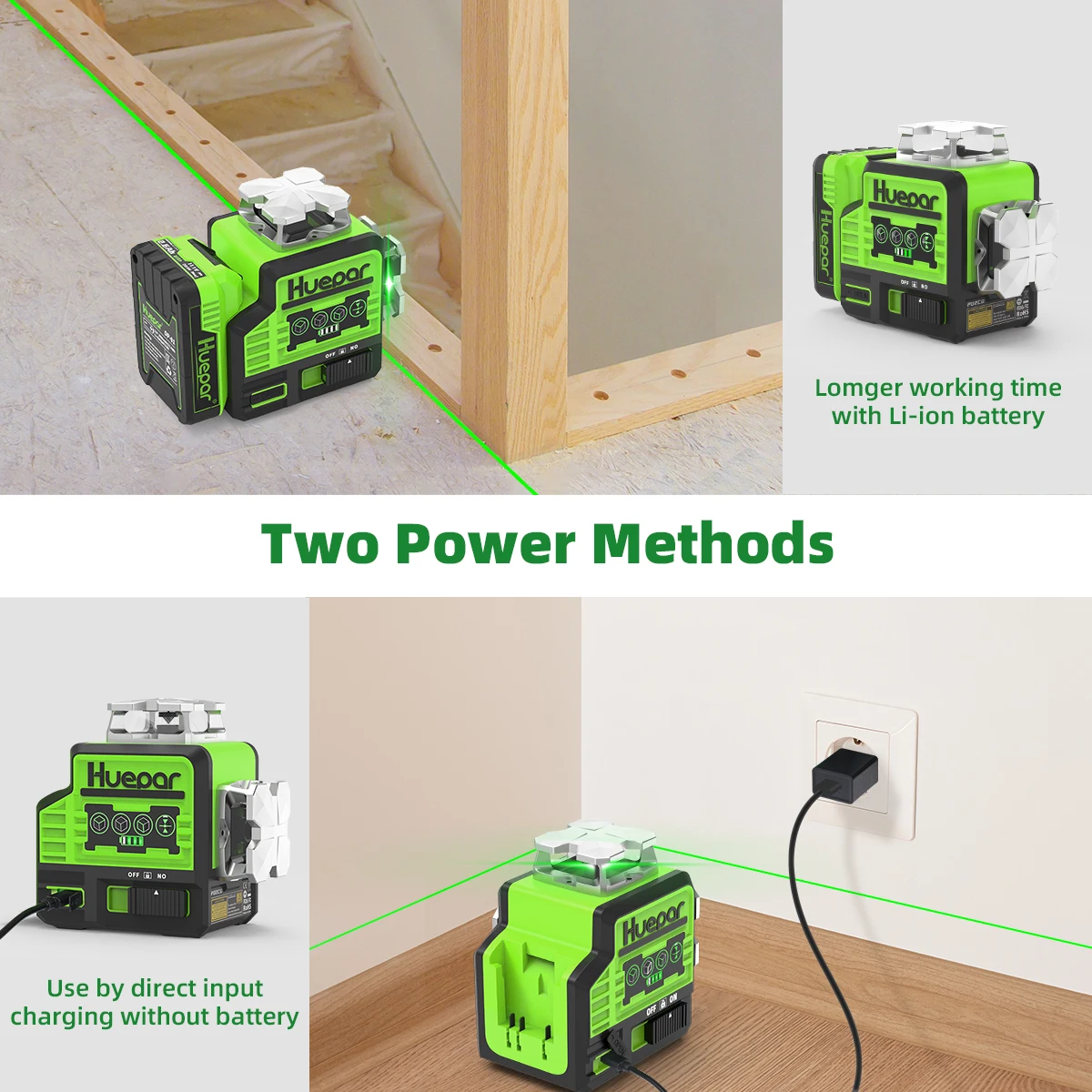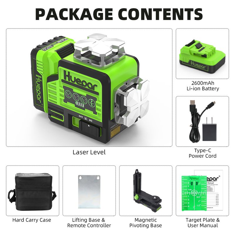 LARGE CAPACITY LI-ION BATTERY&TYPE-C PORT: Huepar P02CG Laser Level adopted 10.8V / 2600mAh Li-ion battery and provides 10 hours running time.The Li-ion Battery can be charged separately and can be quickly released and installed for rasy use. The four power indicator on the machine allow users to know the charging status. The Li-ion battery pack With Type-C charging port, the laser level can also be charged by phone, laptop, power bank, car charger, etc.