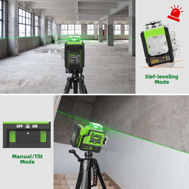 2x360° FULL LAYOUT LASER TOOL:Huepar Laser Level have one horizontal 360° plane, one vertical 360° planes, which can cover the floor, walls and ceiling all around the room. Each button on this laser level corresponds to a single laser line, you can easily choose to turn on/off any laser line.Unlock the pendulum, the laser level will self-level within 4°. Once pendulum locked, it switches to manual mode to lock lines for use at any angle.