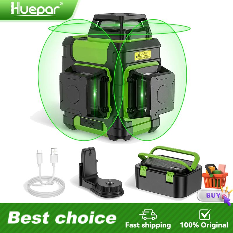 Huepar 3D Cross Line Laser Level Rechargeable Self-leveling Green Laser Tool With Li-ion Battery & Pulse Mode & Hard Case HM03CG