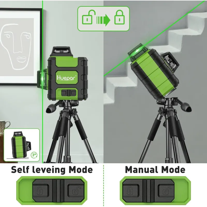Huepar HM03CG 3D laser level with slide switch enables you to set with self-leveling mode & manual mode.
