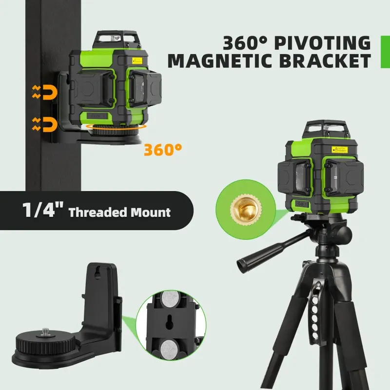 This green line laser has 1/4"-20 mount thread to be fixed on a tripod. 360°Strong magnetic bracket allows for quick positioning to metal surfaces to hang the laser tool to the required angle and offers 1/4"-20 & 5/8"-11 mounting threads to suit different tripod threads. Two nail holes for more fixing methods when working. Two nail holes on the bracket for more fixing methods and suitable for picture & wallpaper hanging at home projects.