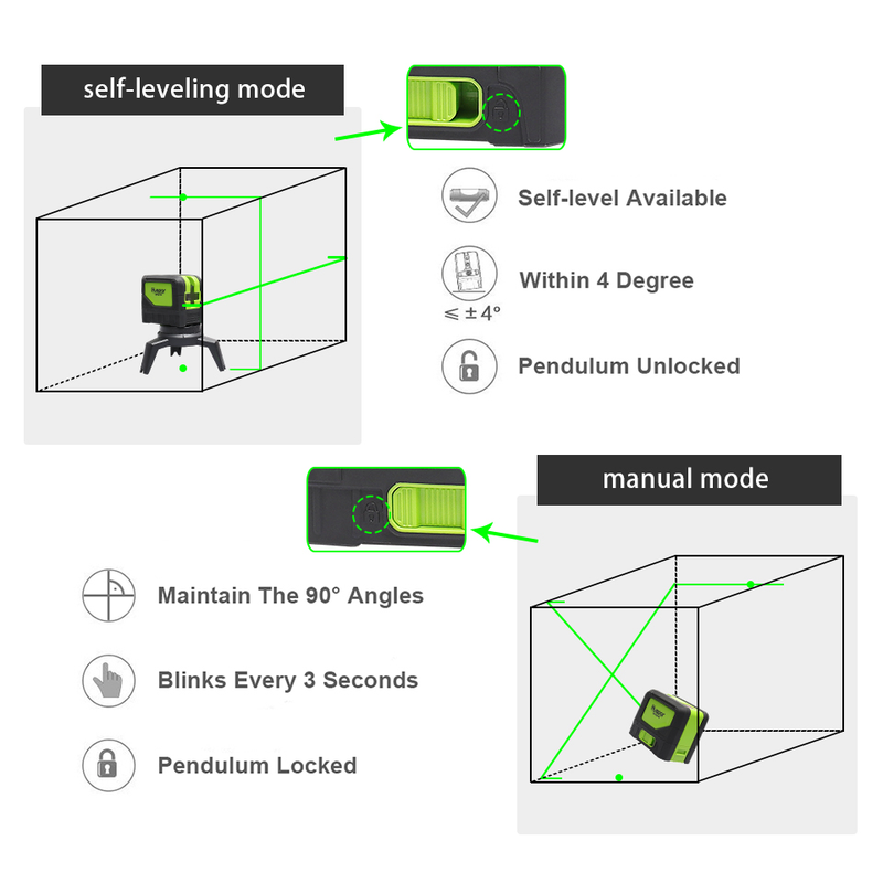 TWO MODES: The self-leveling function that gives you accurate marks almost instantly. Manual mode perform layout tasks with any angle you like. (Can not switch from horizontal and vertical lines to plumb dots).
