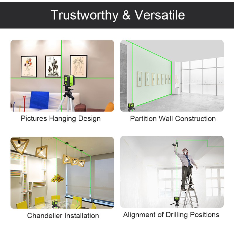 Just gently press the power button to activate this device, easily project a cross line laser with plumb bob. Highly-visible laser lines with wide 110º horizontal, 180º vertical fan angles - easily-seen, long lines minimize the need to reposition the unit.