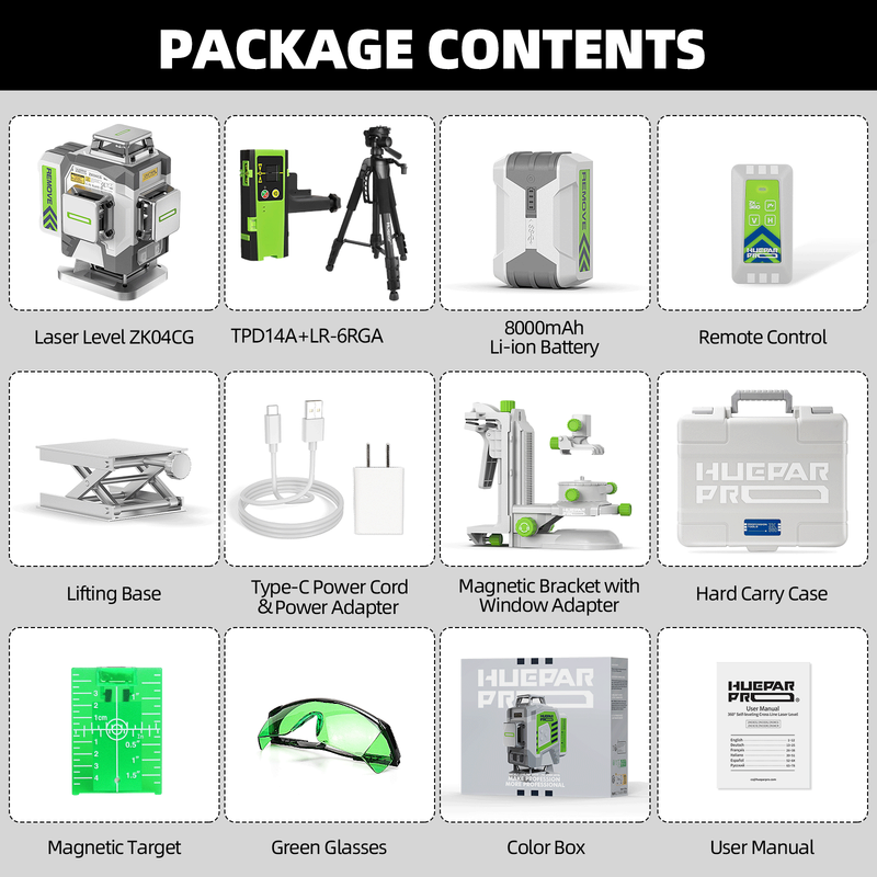 Huepar ZK04CG 4 x 360 2±mm Accuracy Green Laser Level Specifications: