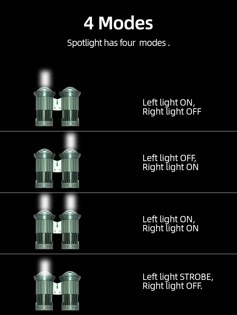 Mode:4 modes:left light ON, right light OFF/left light OFF, right light ON/left light ON, right light ON/left light STROBE, right light OFF