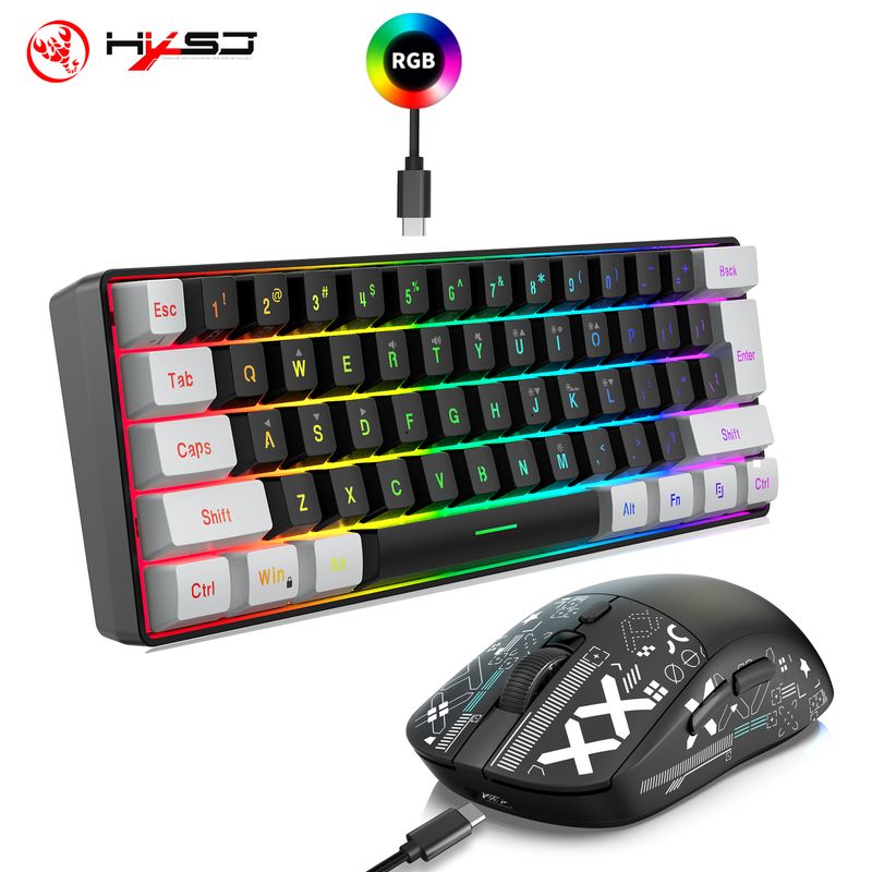 HXSJ-60% RGB Backlit Gaming Keyboard and Mouse Set 61-Key wired Keyboard 3-mode optical gaming wireless mouse for laptop PC