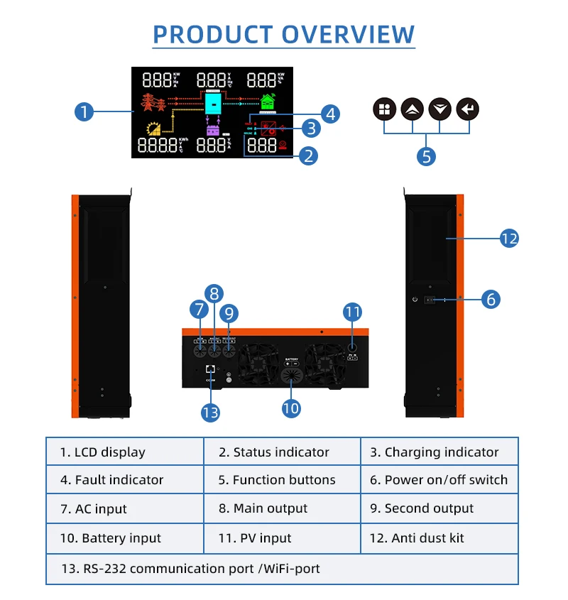 3. Starting sequence: first turn on the battery switch, start the inverter, and turn on the PV, mains and load switches.