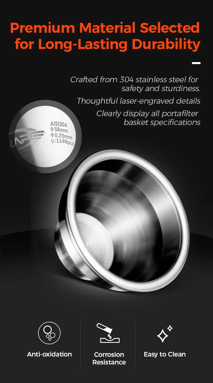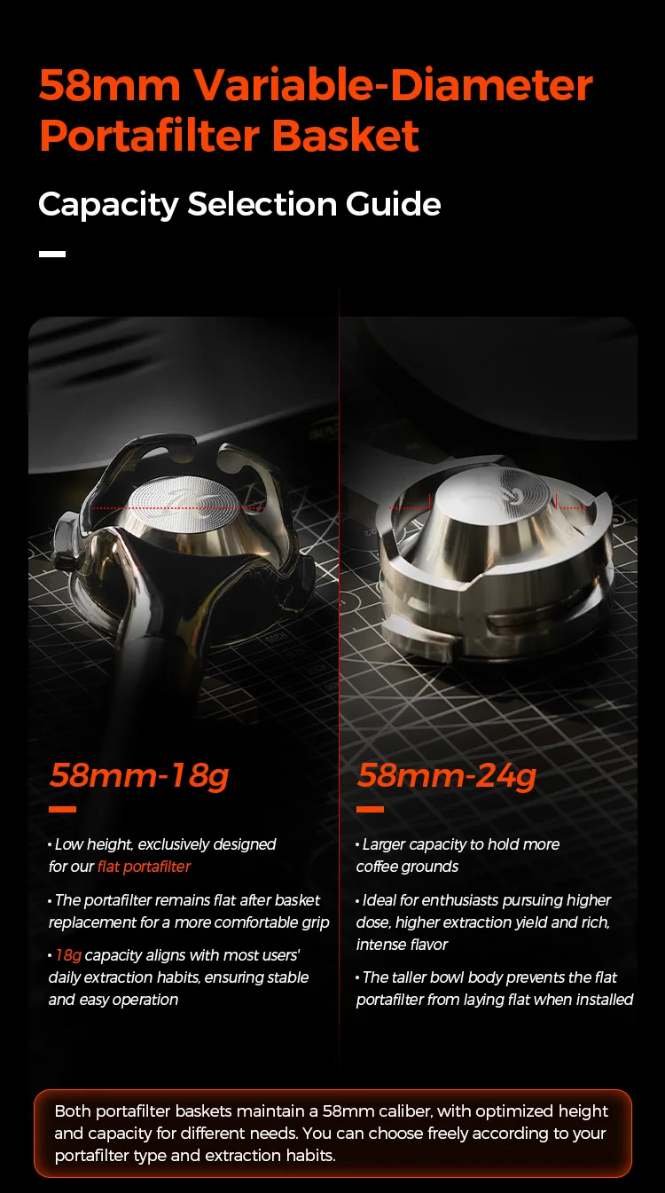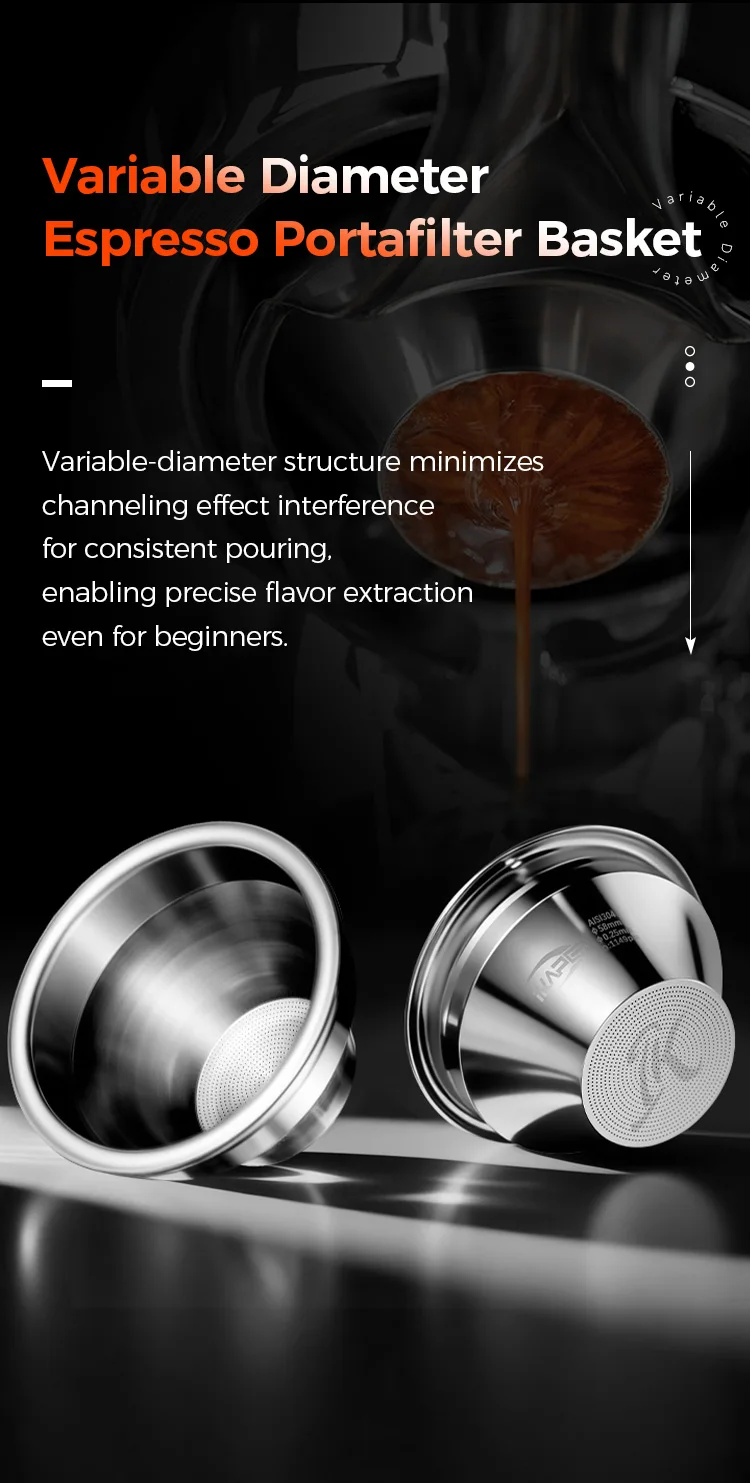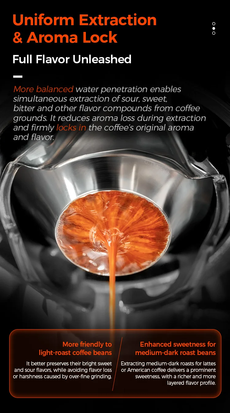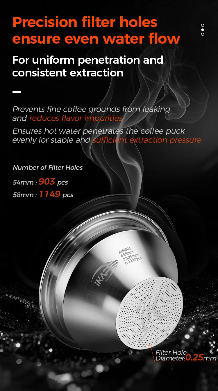 Traditional 58mm baskets, used with 58mm espresso machine brew heads, require a finer grind for the same 18g of coffee grounds to achieve a stable 9 bar extraction pressure. This can increase extraction yield and provide a more balanced flavor, but it can also easily extract bitter substances and off-flavors.