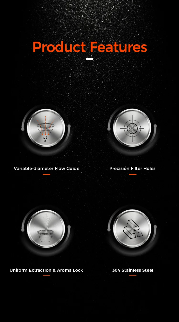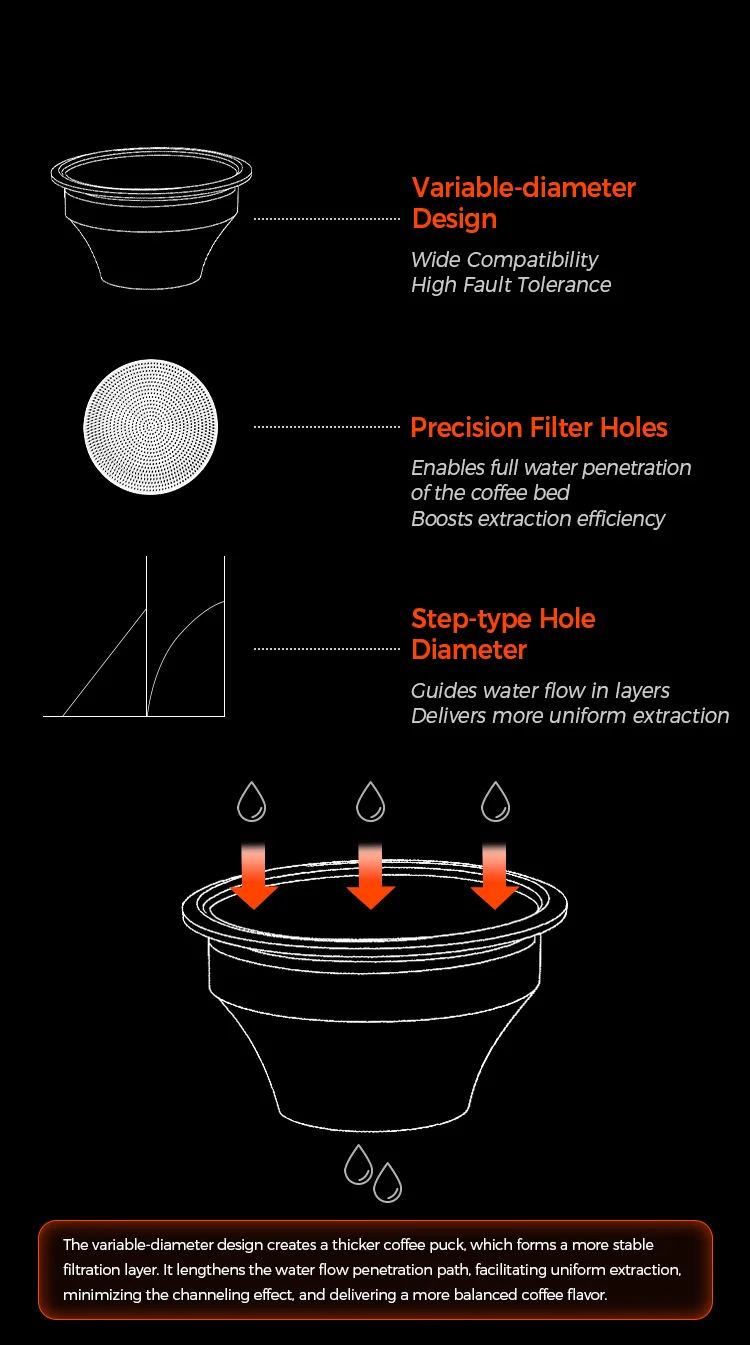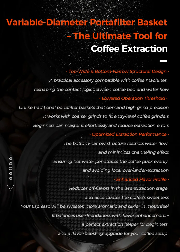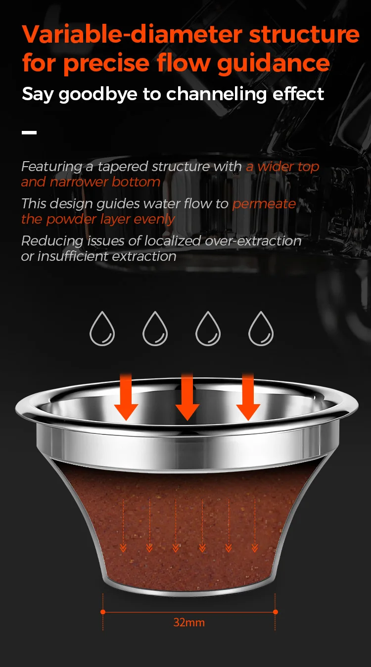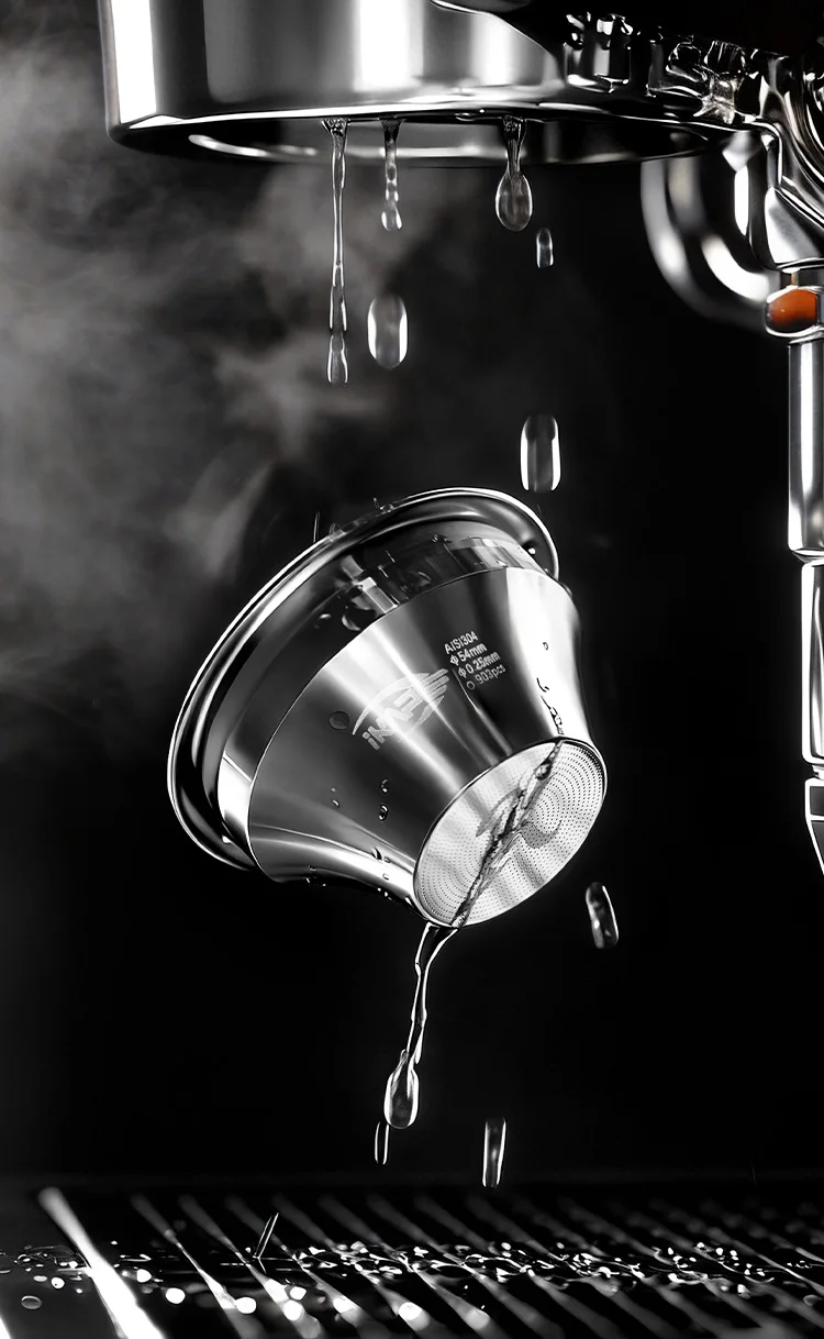 With a step-down portafilter basket , using the same 18 grams of coffee beans, or even less, the smaller basket diameter results in a thicker coffee puck, requiring a coarser grind. This is conducive to extracting sweeter espresso, while reducing the sharp flavors in the coffee beans. Overall, the resulting espresso is sweeter, more aromatic, and has a smoother mouthfeel.